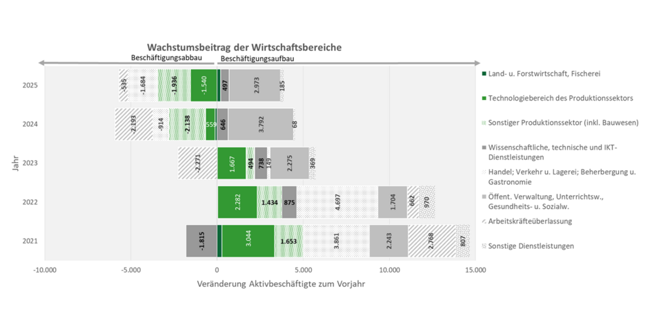 Der steirische Industriebereich verzeichnete im Jahr 2025 mit 119.559 Beschäftigungsverhältnissen einen Beschäftigungsrückgang um -2,5 %, wobei – wie bereits im Vorjahr – insbesondere der steirische Fahrzeugbau (ÖNACE 29-30) betroffen ist: Mit -1.766 Beschäftigungsverhältnissen (-11,8 %) fiel der Rückgang sogar doppelt so hoch aus wie im Jahr 2024 (-887 Beschäftigungsverhältnisse). Auch in der Herstellung von Metallerzeugnissen (ÖNACE 25) macht sich die anhaltende Schwäche der Industrie bemerkbar. Der Beschäftigungsrückgang fiel in diesem Bereich mit -4,8 % bzw. -576 Beschäftigungsverhältnissen ebenfalls mehr als doppelt so hoch wie im Jahr 2024 aus (-232 Beschäftigungsverhältnisse). Weiters deutliche Rückgänge verzeichnete der Bereich Metallerzeugung und -bearbeitung (ÖNACE 24; -3,5 % bzw. -383 Beschäftigungsverhältnisse), ein Bereich, der in den Vorjahren noch Beschäftigung aufbaute. Als robust hingegen zeigen sich beispielsweise die Bereiche pharmazeutische Erzeugnisse (+5,1 % bzw. +124 Beschäftigungsverhältnisse), der Maschinenbau (ÖNACE 28) (+0,9 % bzw. 134 Beschäftigungsverhältnisse) sowie der Bereich der chemischen Erzeugnisse (2025: + 3,8 % bzw. +60 Beschäftigungsverhältnisse). Auch die Nahrungs-, Futtermittel-, Getränkeherstellung u. Tabakverarbeitung (ÖNACE 10-12) legte abermals an Beschäftigung zu und erzielte absolut betrachtet das drittstärkste Beschäftigungsplus in der Industrie (+0,9 % bzw. +102 Beschäftigungsverhältnisse). Die holzverarbeitende Industrie (ÖNACE 16) baute 2025 wieder Beschäftigung auf (2025: +1,7 % bzw. +75 Beschäftigungsverhältnisse), während der Bereich der Energie- und Wasserversorgung, Entsorgung u. Rückgewinnung (ÖNACE D-E) Beschäftigung abbaute (-2,3 % bzw.-168 Beschäftigungsverhältnisse). Neben der Industrie ist auch die Bauwirtschaft von der weiterhin sehr schwachen Konjunktur (allen voran der Hochbaubereich) betroffen (-1,0 % bzw. -382 Beschäftigungsverhältnisse im Jahr 2025).