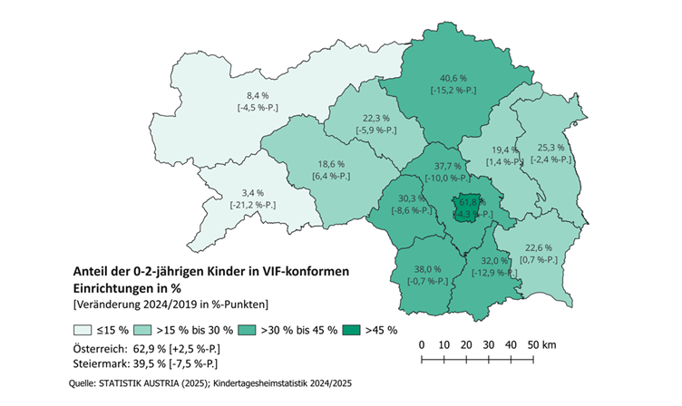Ein Vergleich zwischen den steirischen Bezirken zeigt deutliche Unterschiede. Insbesondere in den ländlichen Bezirken Murau und Liezen fällt der Anteil an Kindern in VIF-konformen Einrichtungen mit 3,4 % bzw. 8,4 % bei den 0-2-Jährigen verschwindend gering aus und selbst bei den 3-5-jährigen Kindern ist eine Vollzeitarbeit bei überwiegenden Mehrheit der betreuten Kinder nicht möglich.