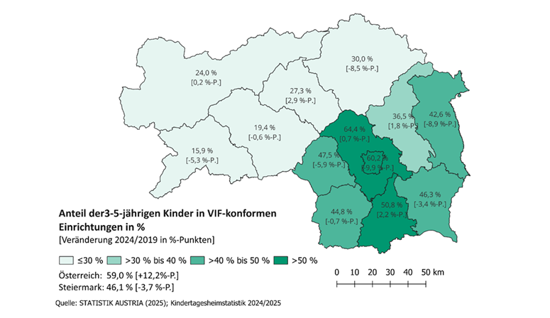 Die Verfügbarkeit von ausreichenden Kinderbetreuungsplätzen wirkt sich auf die individuelle Lebenssituation der Eltern und hier wiederum insbesondere auf die Mütter aus. Dabei spielt nicht nur das Vorhandensein eines Betreuungsplatzes eine Rolle, auch Rahmenbedingungen wie Öffnungszeiten, Anzahl an Schließtagen etc. sind entscheidend im Hinblick der Vereinbarkeit von Beruf und Familie. Entsprechend dem Vereinbarkeitsindikator Beruf und Familie (VIF-Indikator) kann aufgezeigt werden, wie viele Kinder einen Betreuungsplatz haben, der mit einer Vollzeittätigkeit der Eltern vereinbar ist. Weniger als vier von zehn der in der Steiermark betreuten 0-2-jährigen Kinder (39,5 %) befindet sich in einer VIF-konformen Einrichtung. Die Steiermark nimmt, vor Oberösterreich, den vorletzten Platz ein. Vergleicht man die Entwicklung mit dem Kindergartenjahr 2019/2020 zeigt sich sogar ein Rückgang der betreuten Kinder in einer VIF-konformen Einrichtung (-7,5 %-Punkte) während österreichweit ein leichter Anstieg verzeichnet wurde. Auch bei den 3-5-Jährigen besteht Aufholbedarf. Mit einem Anteil von 46,1 % wird weniger als jedes zweite betreute Kind zwischen 3 und 5 Jahren in der Steiermark in einer Einrichtung betreut, die eine Vollzeitarbeit ermöglicht. Auch hier zeigt sich im Fünfjahresvergleich ein Rückgang der betreuten Kinder in VIF-konformen Einrichtungen (2019/2020: 49,8 %).
